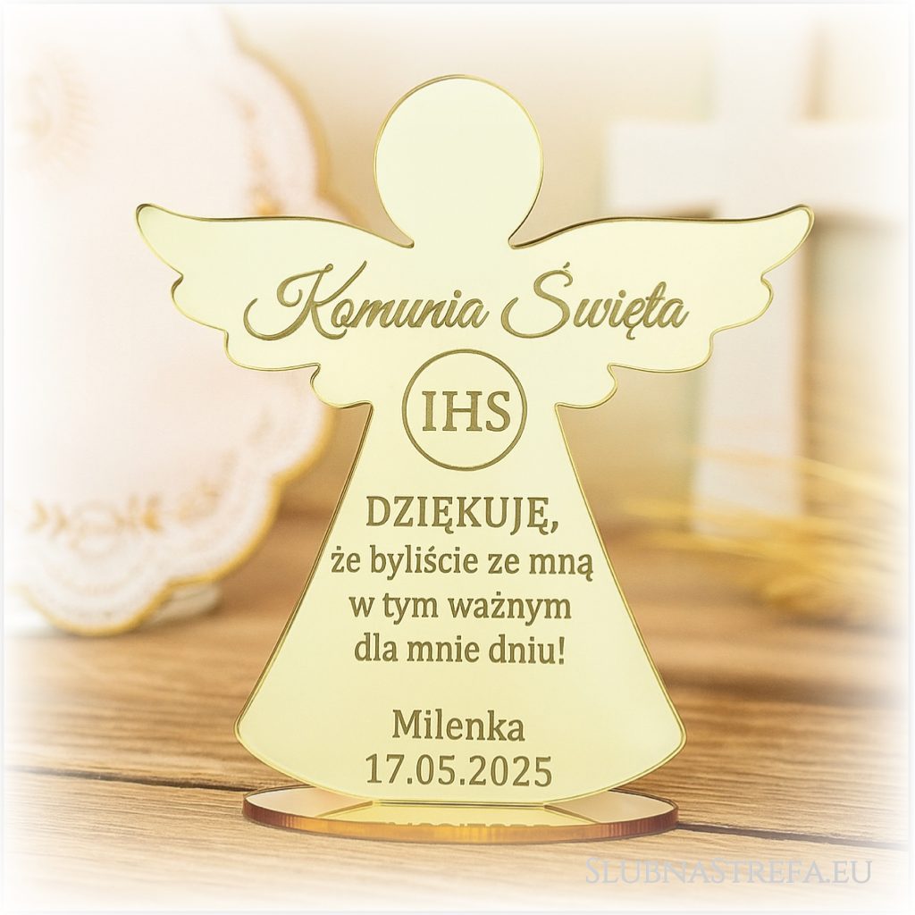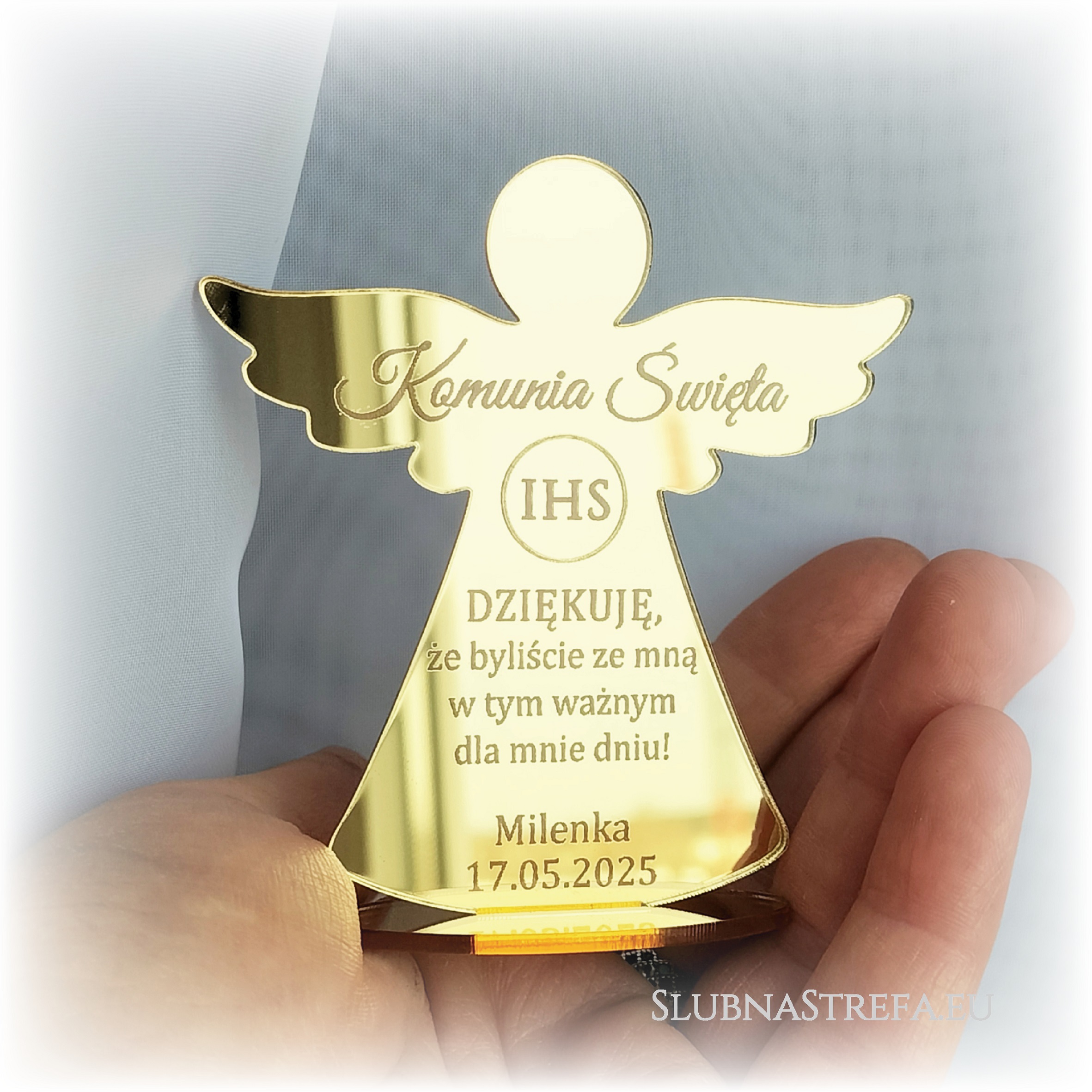 Aniołek stojący złote lustro podziękowanie dla gości KOMUNIA w zestawie z woreczkiem Cena: 10,00 zł Opis Aniołek ze złotej lub srebrnej lustrzanej plexi. W zestawie biały woreczek z organzy. Wysokość około 8cm. Zobacz również inne: Topper złote lustro komunia krzyzyk + imię40,00 zł Brelok lustrzany (anioł, słonik, koniczynka) podziękowania dla gości KOMUNIA, grawer imienia na breloku8,00 zł Brelok lustrzany – anioł, koniczynka lub słonik7,00 zł Drewniane pudełko pamiątkowe na pieniądze komunia40,00 zł