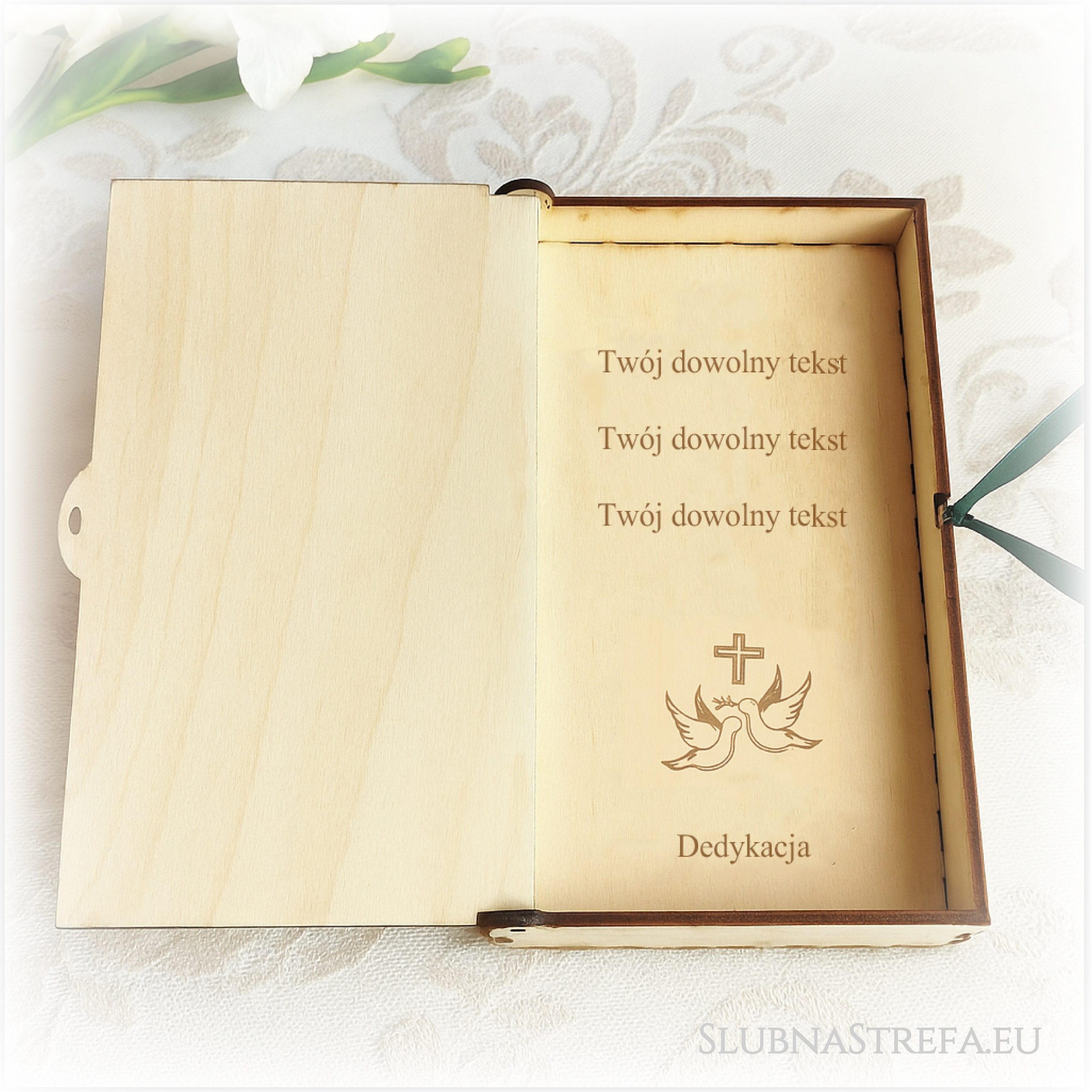 Drewniane pudełko na pieniądze z dedykacją Cena: 49,00 zł Opis Spersonalizowane pudełeczko na pieniądze/drobny upominek. W środku dowolny grawerowany tekst. Zobacz również inne: Topper uniwersalny komunia święta wzór 6 lustrzany40,00 zł Topper uniwersalny komunia święta wzór 4 lustrzany35,00 zł Aniołek stojący dowolne imię Dziewczynka 25-30cm25,00 zł Bilecik z dziurką komunia0,69 zł