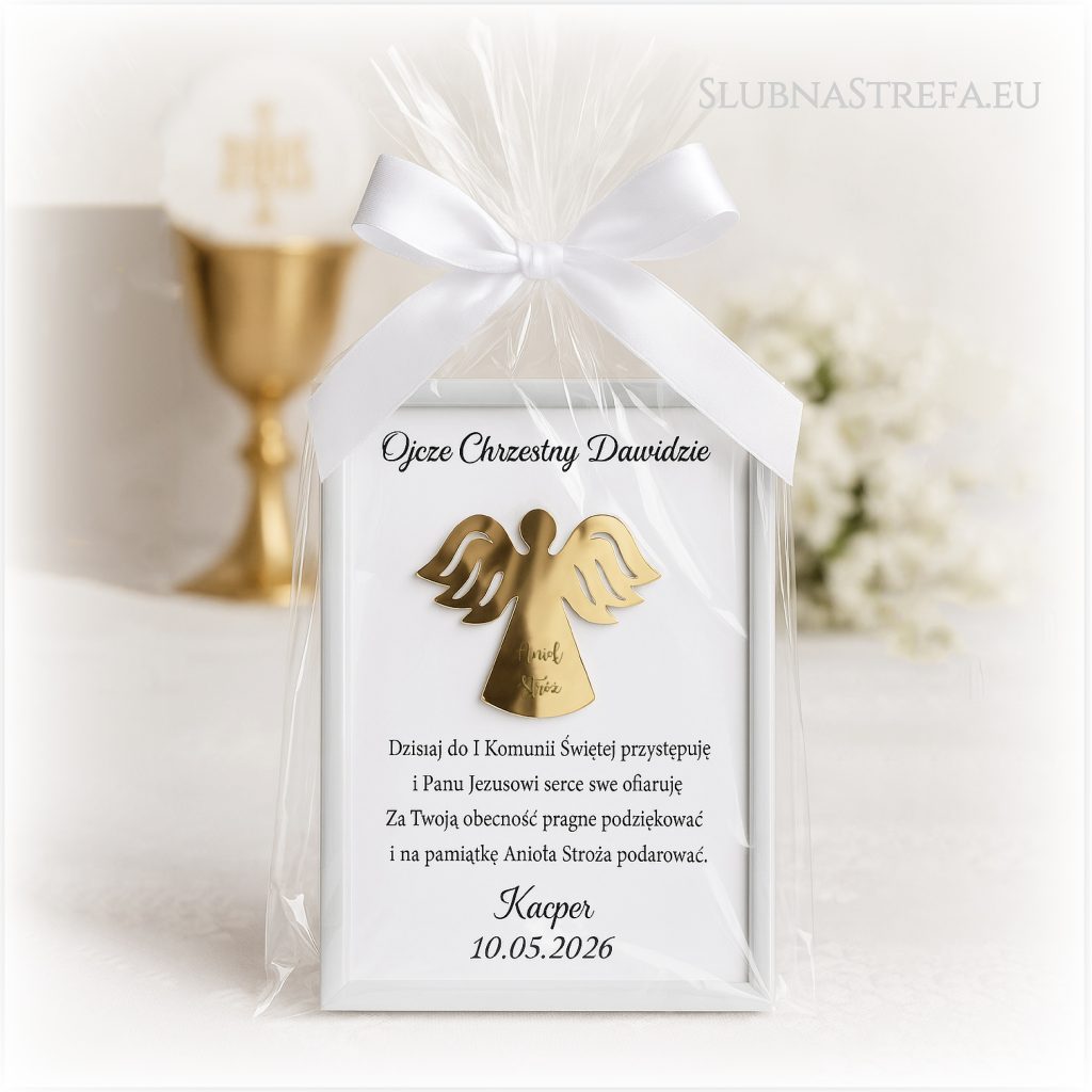 Rozmiar ramki a5. W środku anioł z lustrzanej złotej plexi (dwa wzory anioła do wyboru).